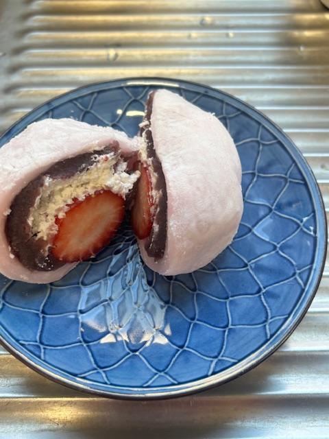 確かに、モチの触感は舌触りにここちよく、いちごは固くなく甘酸っぱさもあり、あんこと中のクリームで絶妙にマッチしており、口に広がります。